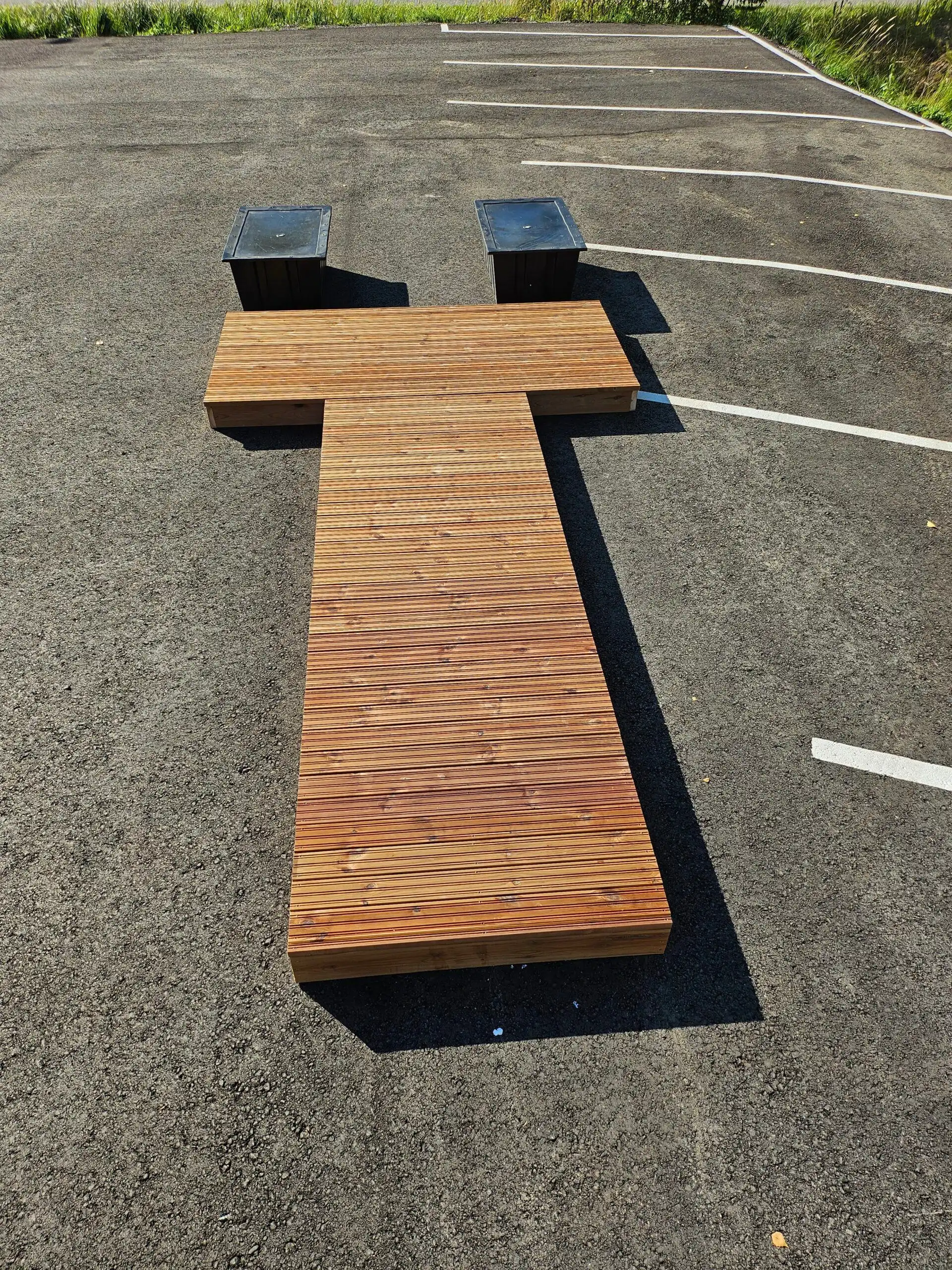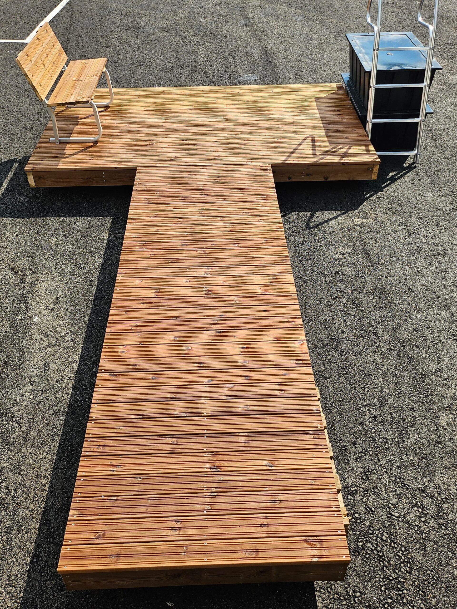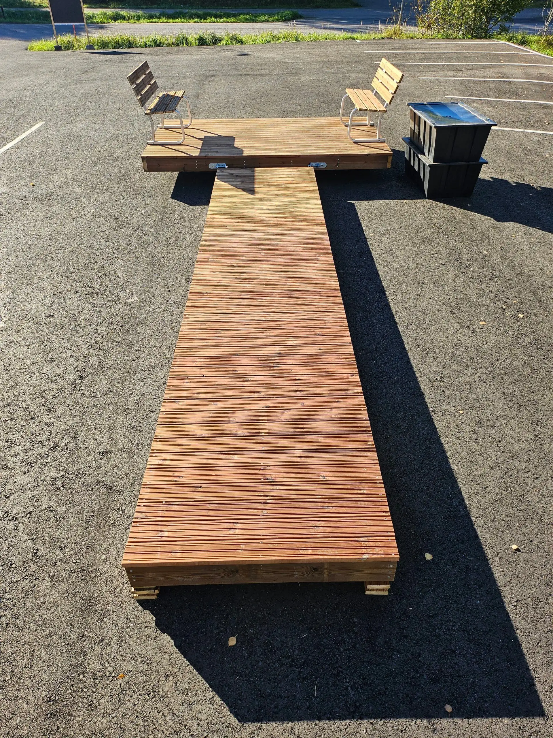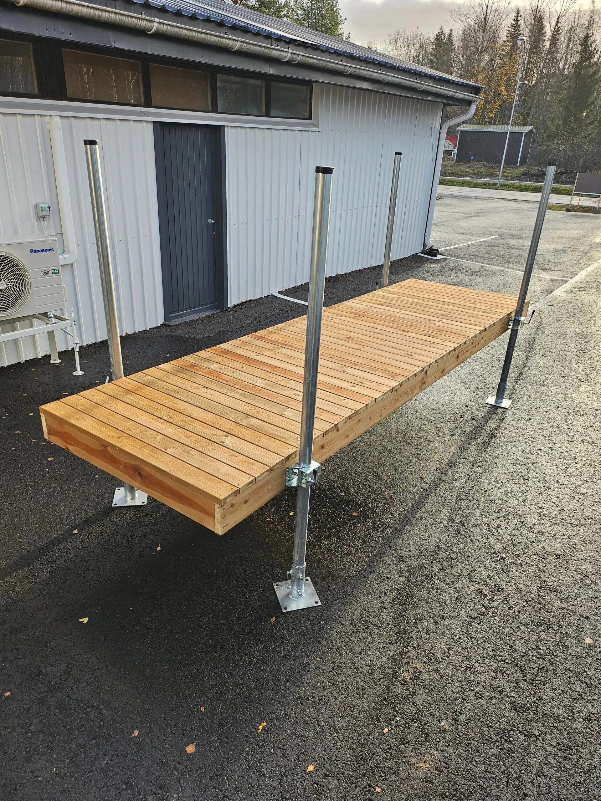 Paleta laituri 7. Vahvarakenteisellä Paleta laiturilla vietät mukavia hetkiä veden äärellä. Mitat. Kävelysilta 5,2m, päätyosa 1,83×3,0m. Yhteispituus 7,03m. Kansipuu uritettu 28x95mm kestopuu, runko 48x148mm kestopuu. Ponttoonit 5kpl joiden kantavuus 1250kg.